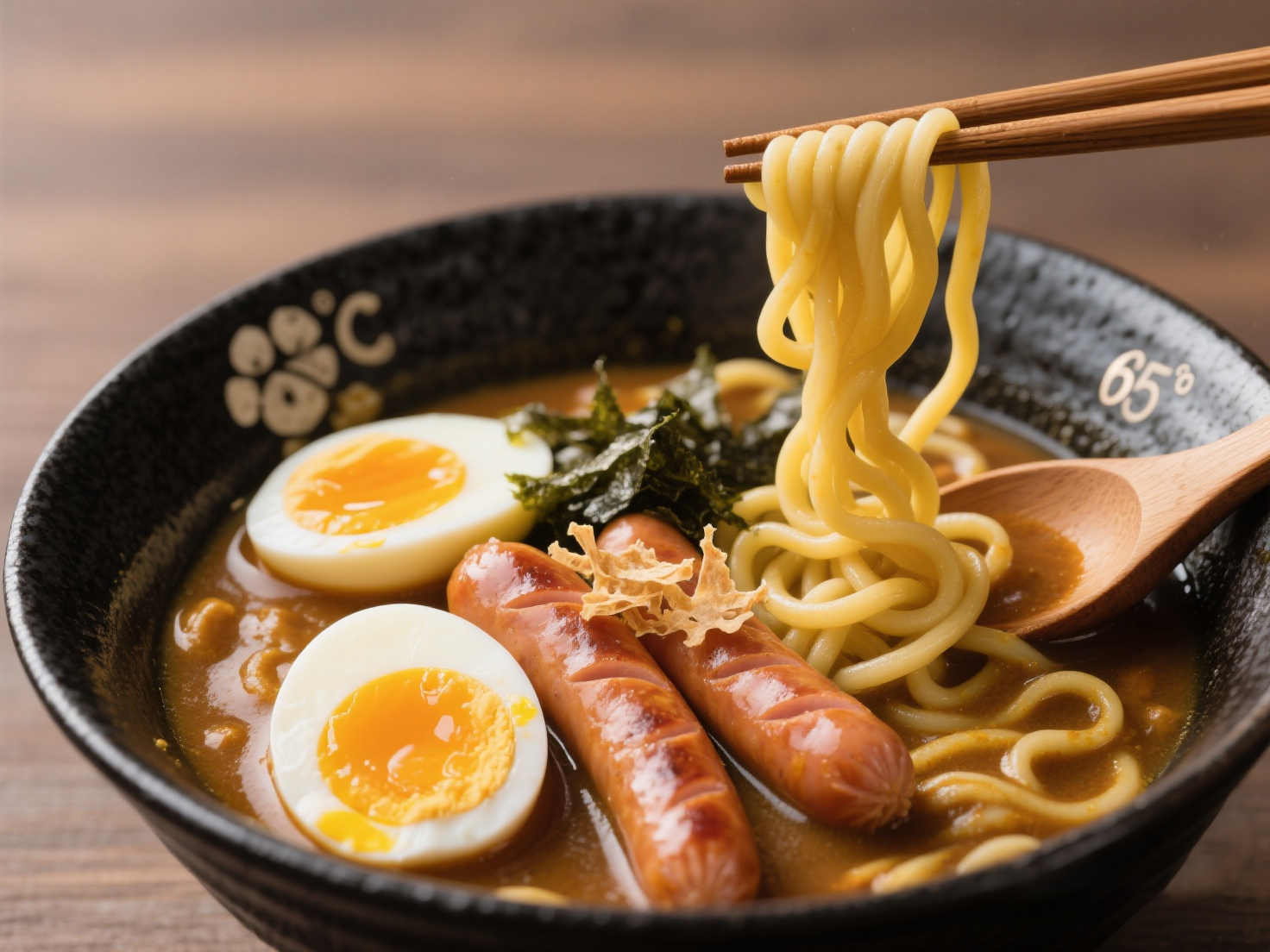 ③ 組合:煮烏冬面 → 入碗 → 澆湯 → 鋪香腸片 → 放溏心蛋 → 撒海苔絲