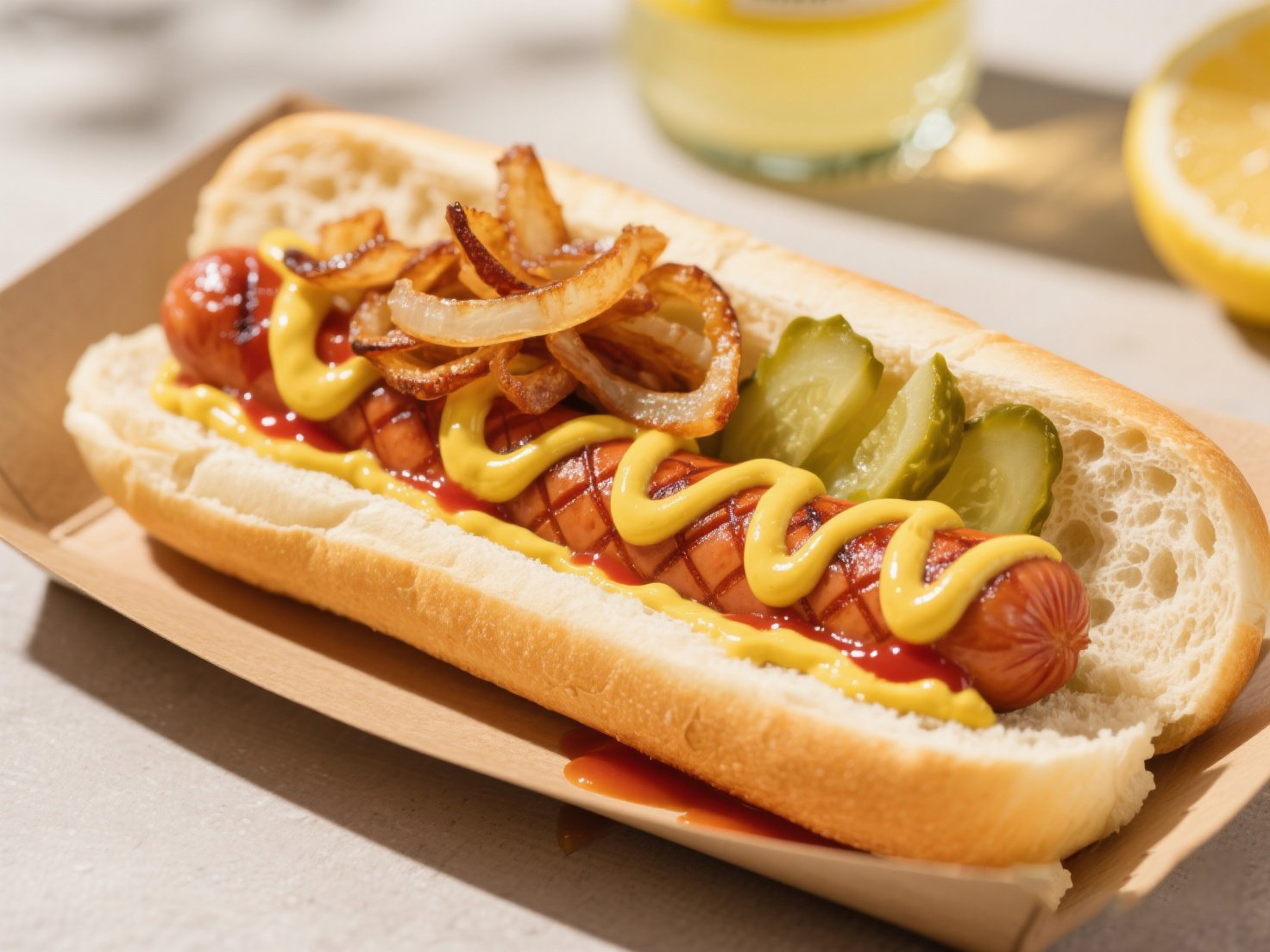 ④組合定型:面包內(nèi)壁先擠混合醬,放入香腸,撒焦糖洋蔥絲,鋪酸黃瓜片+生菜絲,表面Z字形擠醬(增加視覺層次)