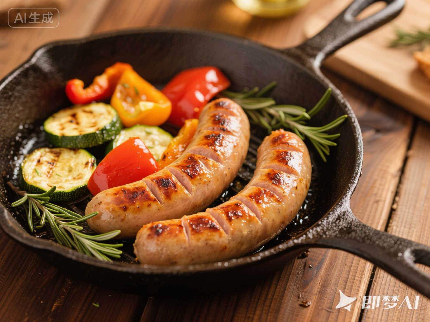 豬肉腸煎至外皮金黃焦脆,肉質(zhì)飽滿多汁,搭配烤時蔬,營養(yǎng)均衡。