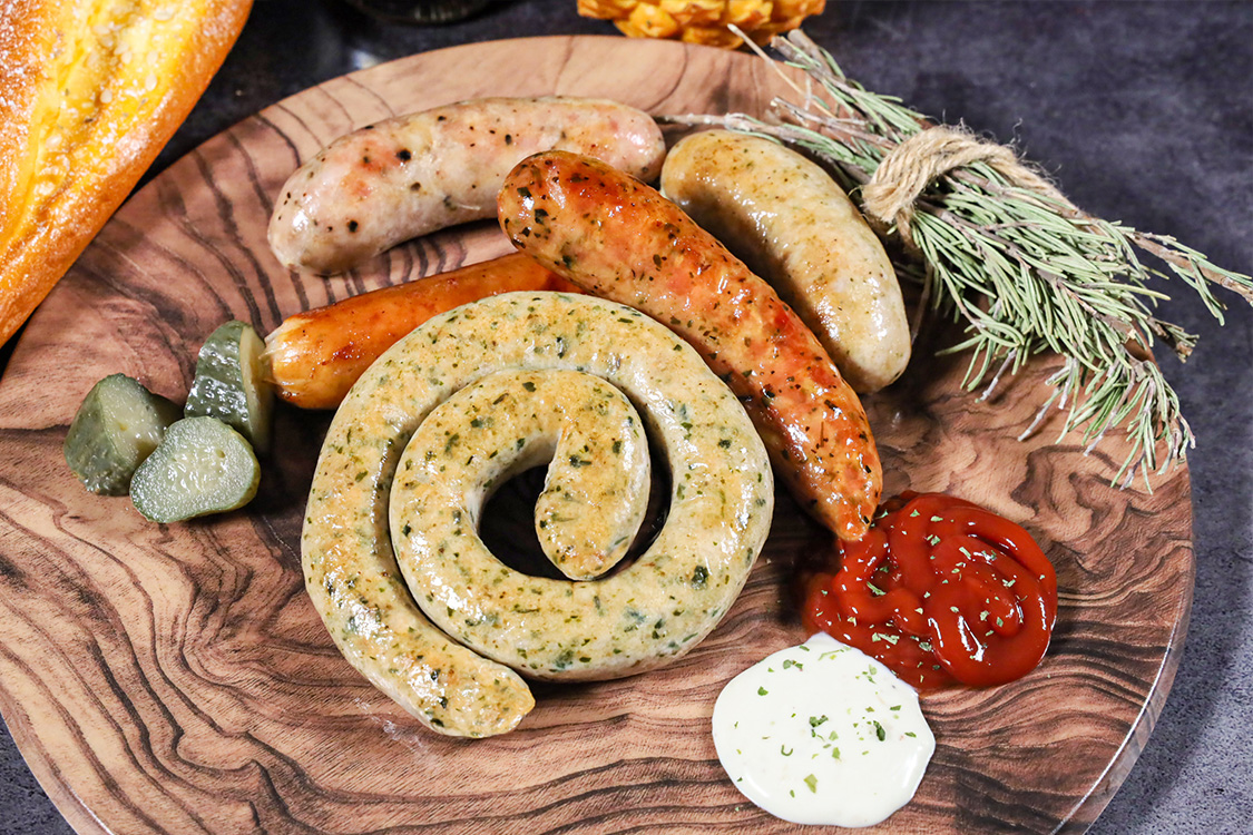 拼盤包含:德式香蔥油煎盤腸、圖林根香腸、龍戈尼茲香腸、牛肉奶酪香腸、羅勒葉香腸