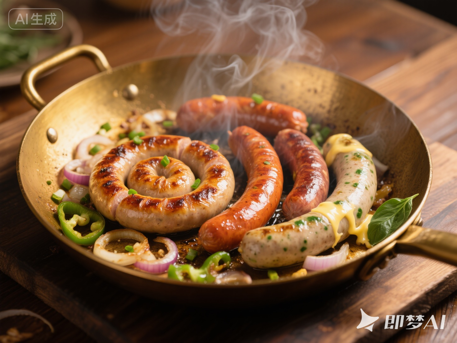 ② 在平底鍋中倒入食用油,依次放入香腸,每面煎3-4分鐘,至表面金黃酥脆。翻面時(shí)用夾子輕壓,確保內(nèi)部熟透;