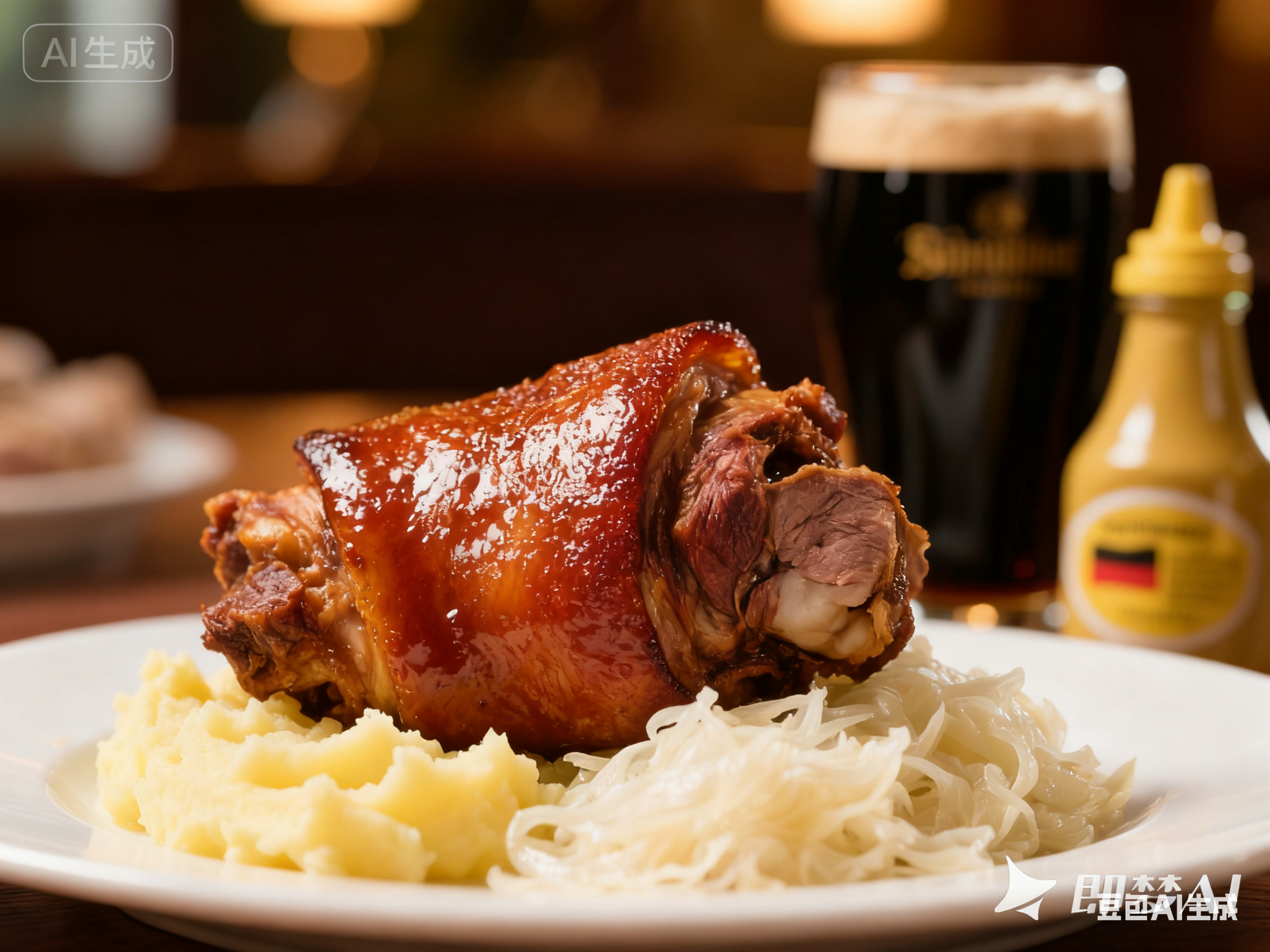 ④ 組裝裝盤:在盤子一側(cè)鋪上土豆泥,另一側(cè)放上德式酸菜,中間擺放上烤好的、色澤紅亮如火焰的脆皮豬肘。搭配黃芥末醬或德式芥末醬一同上桌。